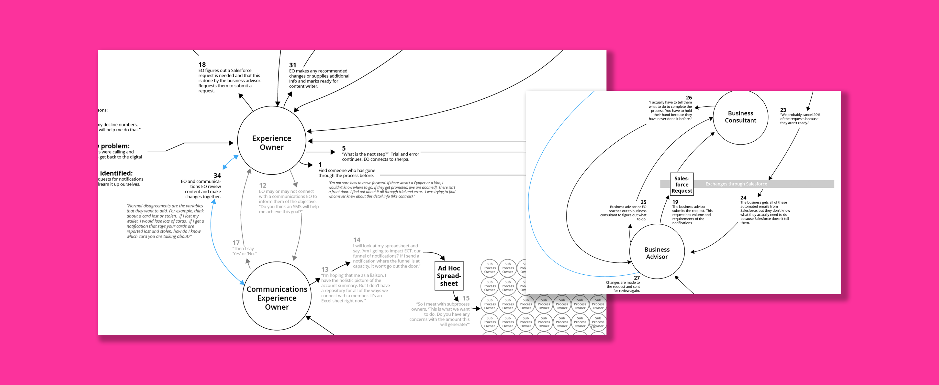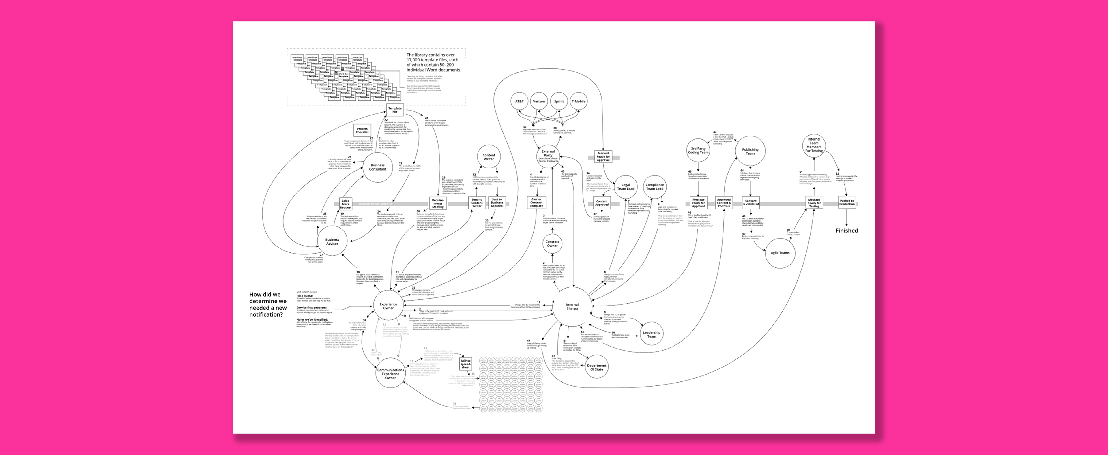 We interviewed dozens of process participants around the business created an end-to-end map of the current system. To send a new text message it took 6 months, collaboration of 78 people across 11 team and $250,000 in time and contracts.